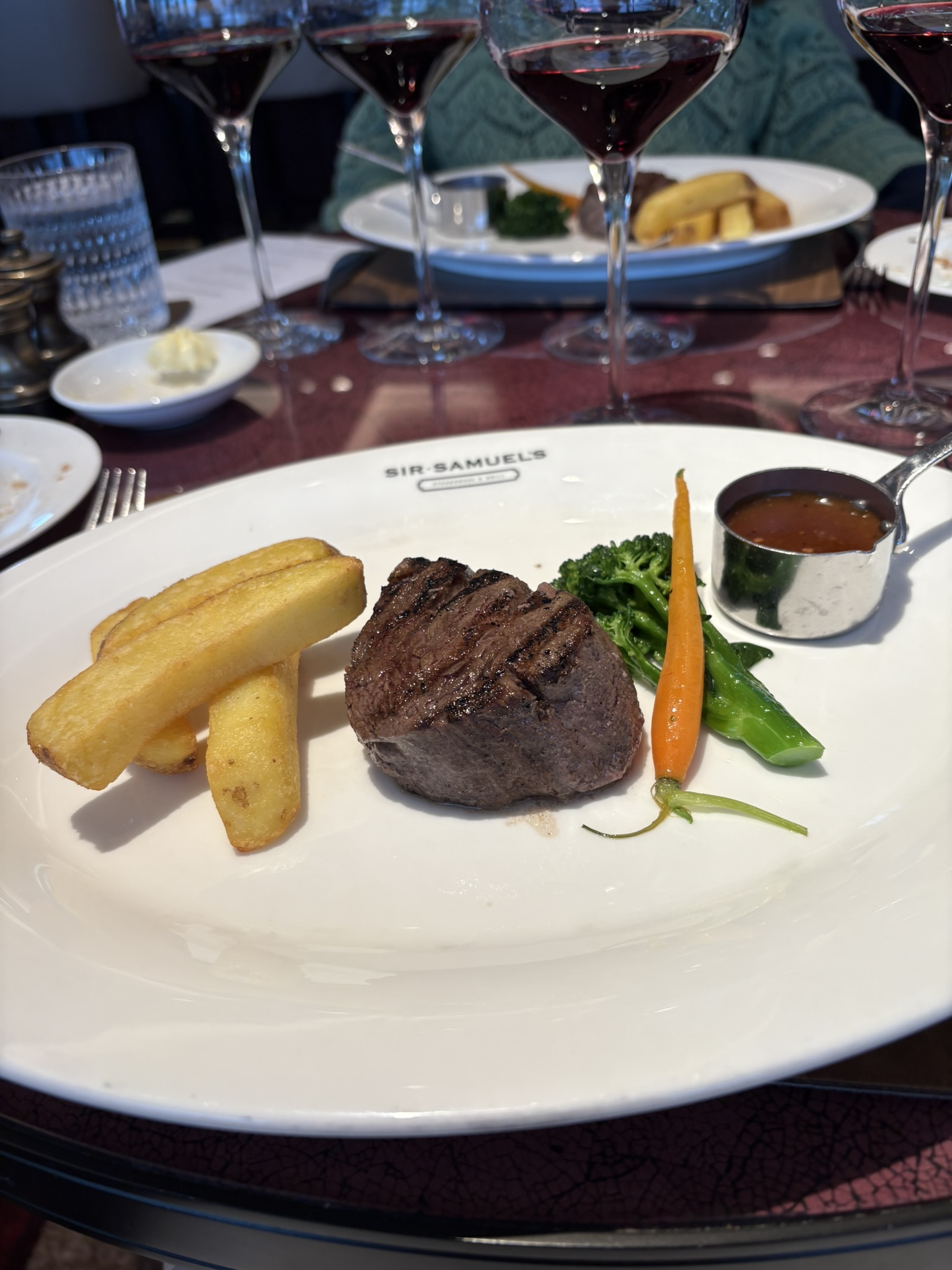 Afterwards we had a chat with the head sommelier, and I discovered that the ship leaves Southampton with around 30,000 wines in the main cellar, which sounds like a lot but with 3,000 passengers, it’s 10 bottles each for a full journey. We also had a lovely chat during lunch with the people on the next table, Jo and Jim, a pair of inveterate foodies, whose son is a chef. Said son, Chris, is head chef at a restaurant in Woburn, Margo’s, which is around half an hour from home for us, so we will likely go and talk to Chris, and try out his cooking sometime soon.