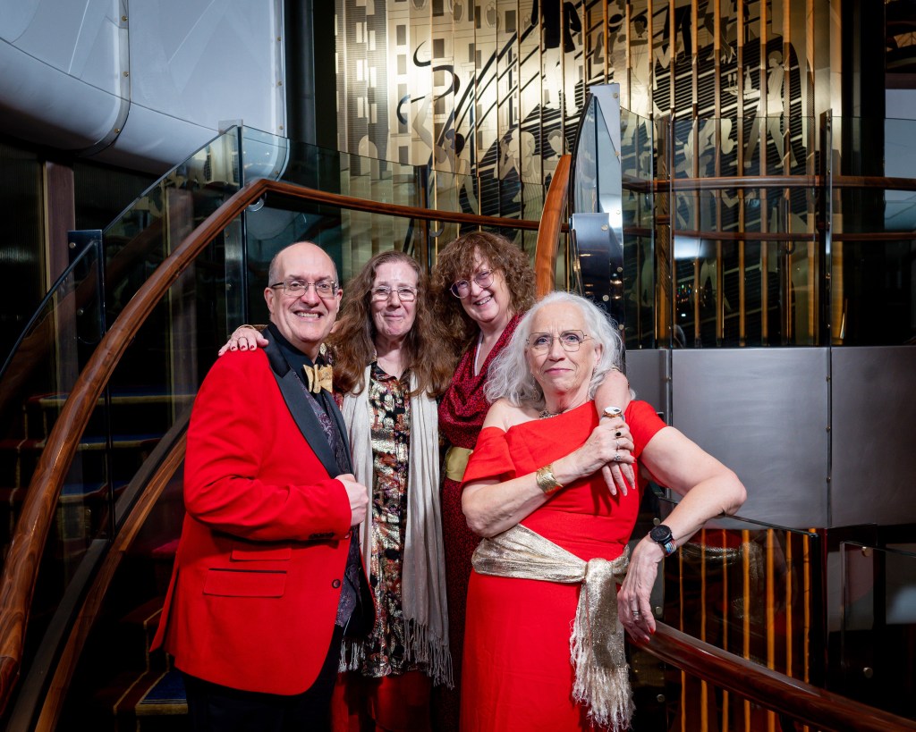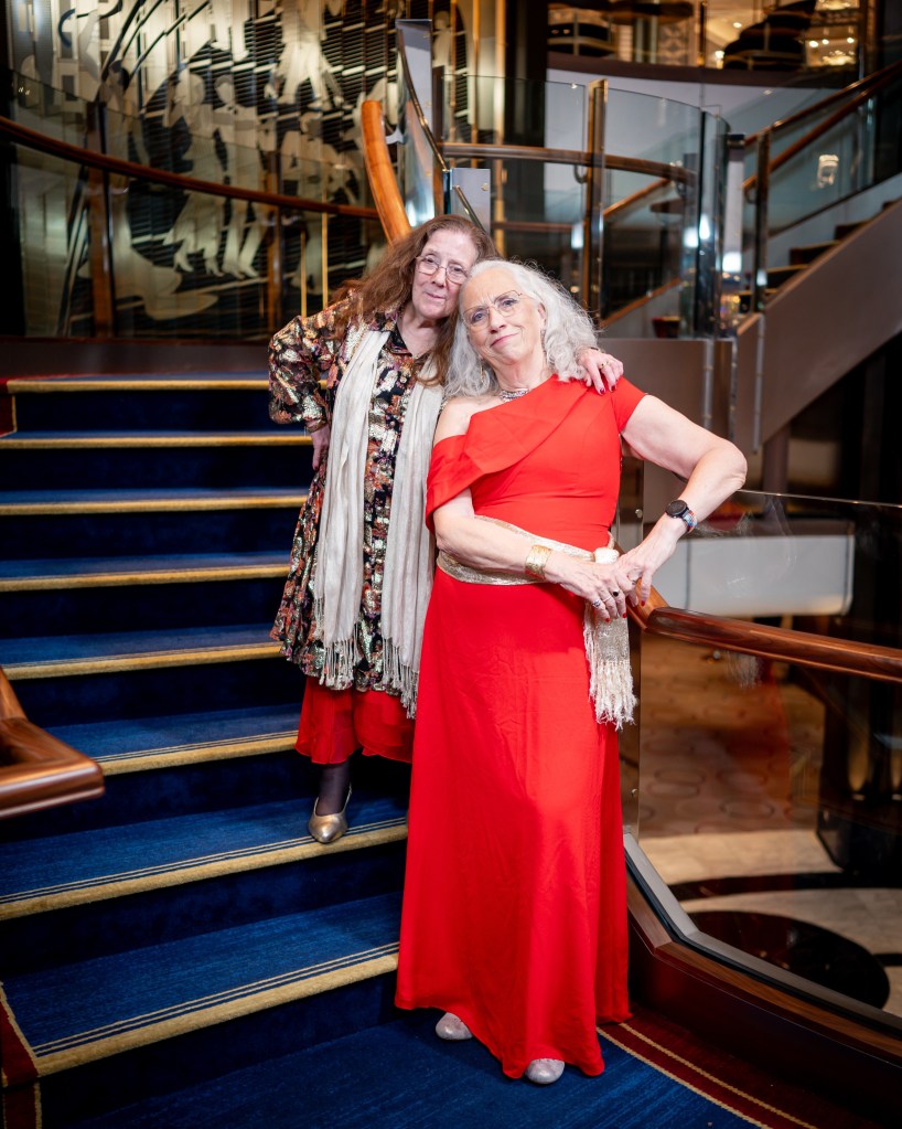 We spent a lazy afternoon around the ship, nosing into a variety of places, before getting glammed up for the third and final gala evening, where the theme was red and gold. We had an excellent dinner, and then caught up with Arthur, the photographer, on the stairs from Deck 3 to the Drawing Room on Deck 1. We had a lot of fun, generally messing about with some silly poses, but he did also manage to get some very nice shots too, and seemed to be enjoying our complete lack of formality.