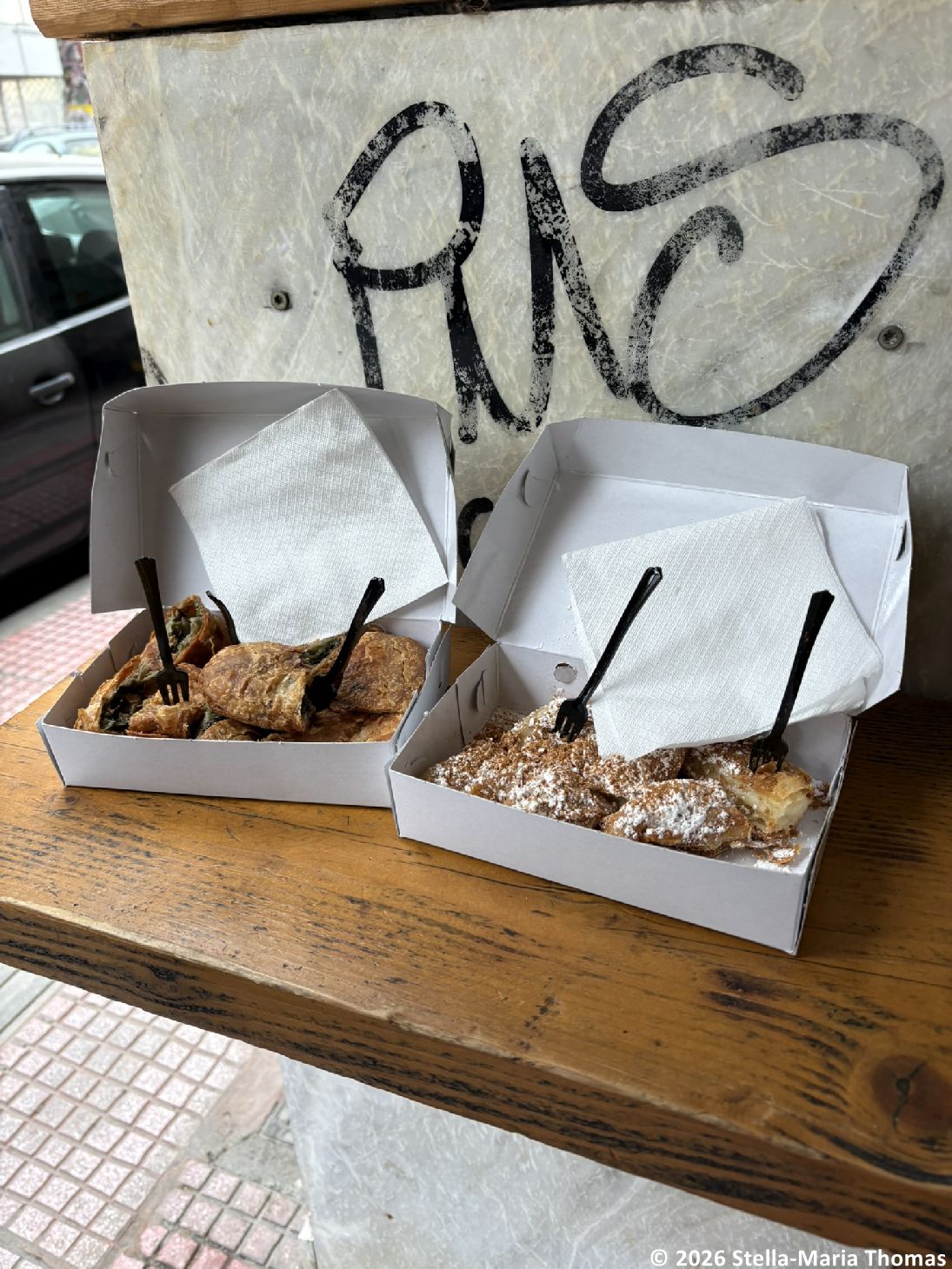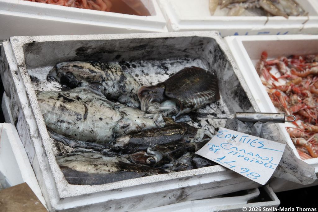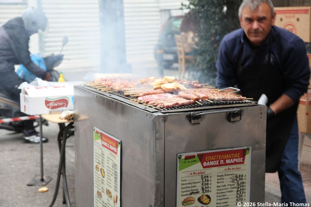 It was all very hunger-inducing so it was just as well we stopped before heading into the market, this time for a souvlaki from a street food stall (though apparently you can only have a stall out on the street if it is in front of your own premises so it’s not street food as some of us know it). The stall we stopped at had some fabulous looking meat “onna stick” going on, and so we sat down to wait for a pork version (traditional) and a chicken one (not so traditional), served with bread toasted over the coals. It was tender and very, very good.