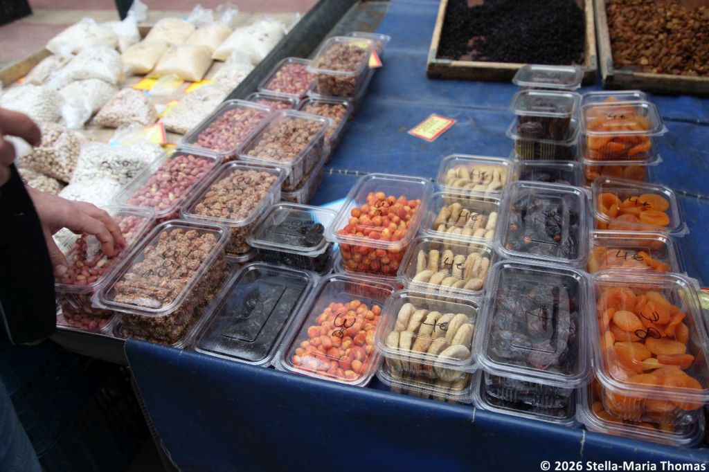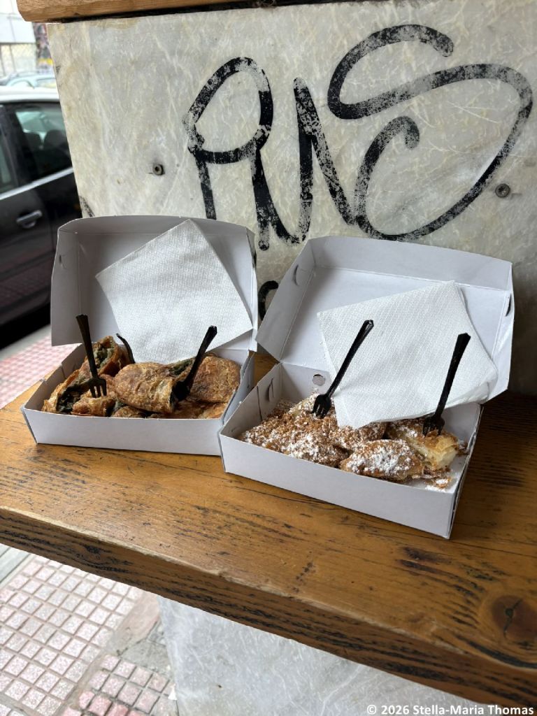 Next we nibbled and tasted our way through the market, with yogurts and cheese and dried fruits, before heading off to try a tiny bakery where you eat outside propped up against a shelf. Here we had a variety of “pies”, this time including bougatsa, which is filled with custard, spanakopita (feta and spinach), and a form of kreatopita (leek and lamb). They were good too, but we couldn’t finish them, especially as we’d also stopped at a local “health food” store where we’d been introduced to carob rusks (a form of food that dates back a very long way apparently because it provides a way of preserving bread for when it’s really needed), and some incredibly dense halva. Constantine had brought a bag with him, and was now carefully filling it with the things we couldn’t finish so we could take them away with us afterwards. I was beginning to think we should not have booked dinner for that night…