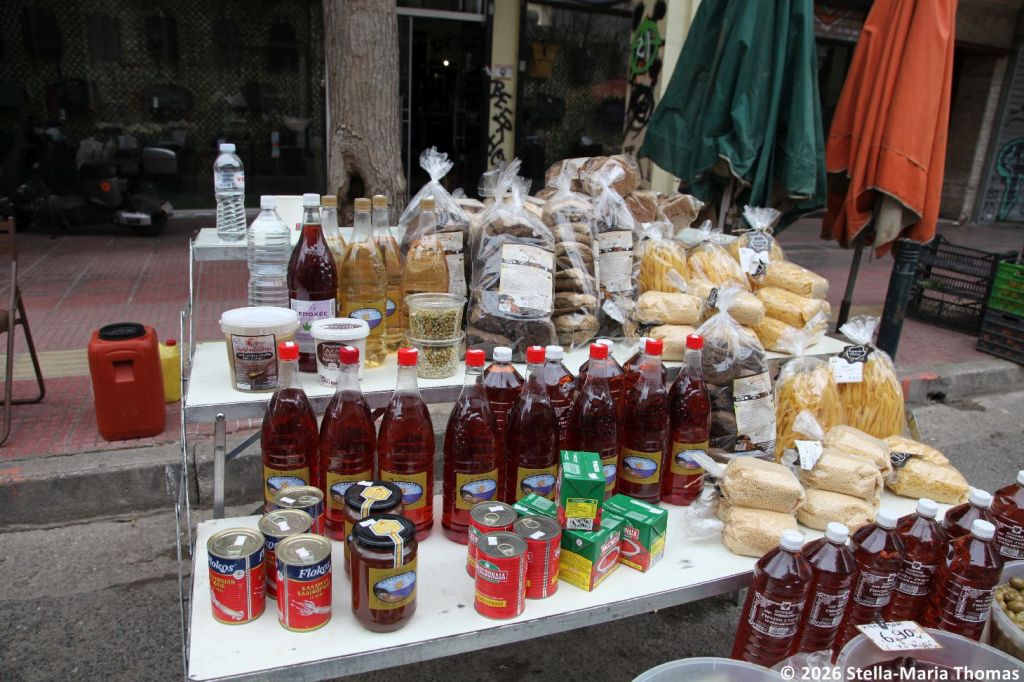 Anyway, we caught the tram to Syngrou-Fix, changed to the metro and arrived at Thisseo station bang on time to meet our guide, Constantine. We had booked a tour through Culinary Backstreets, a company much lauded by the likes of National Geographic, and Food and Travel magazine. It was perhaps more expensive than some, but they seem to go rather more off-piste than many of the other companies. We located Constantine easily enough (he was wearing a very distinctive green baseball cap), and discovered that despite the tour capacity being 7 people, we were the only people booked so in effect we got a private tour. The food started straight away, when Constantine handed us a bag with a koulouri to try. These sesame-seed coated rings are a staple of the city, but apparently the city is no longer handing out licenses to the street traders that used to sell them, and is not issuing any new licenses. What a Greek is supposed to do at 2 in the morning after too many beers is anyone’s guess!