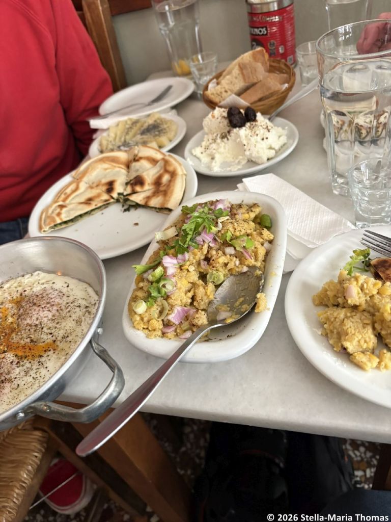 Next thing we know, we’re in a small restaurant with a friendly dog, being confronted by plates of cheeses, humous, stuffed flatbreads, a crushed butter bean dish, and a really delicious egg dish, along with strong drink (raki) and a toned down version which research suggests is called rakomelo, a mix of raki, honey and cinnamon, served warm, and which slips down a treat on a cool day. Apparently it can be bought ready to heat and drink, but this was a home made version and all the better for it.