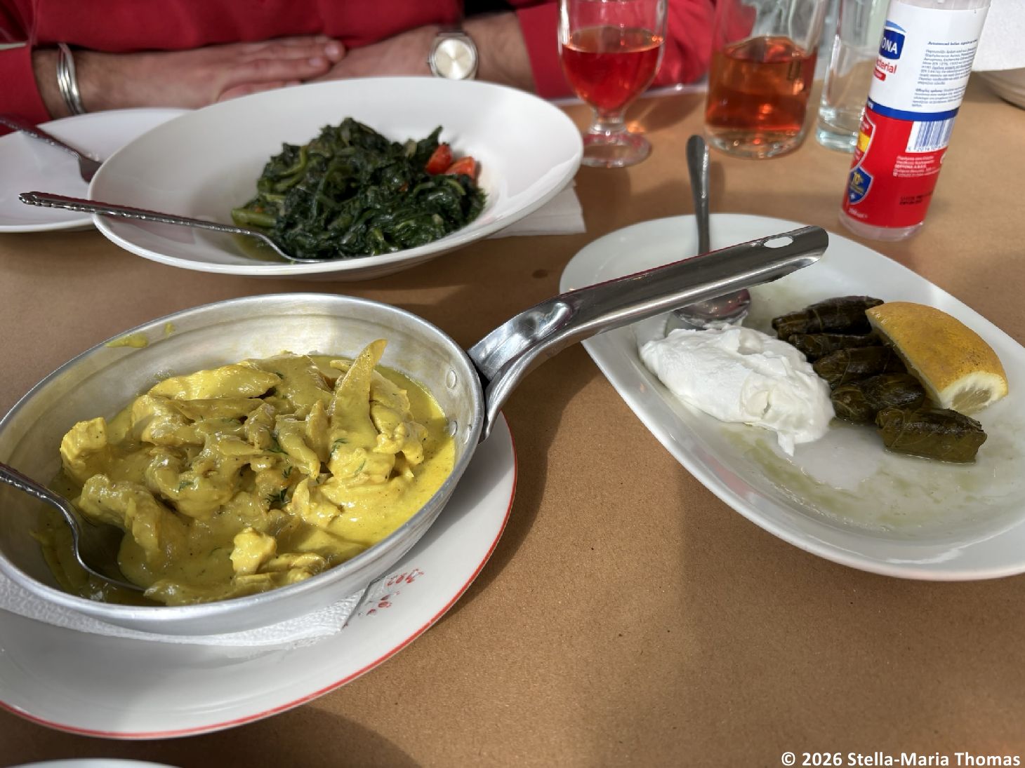We were slowing down now and Constantine had warned us that there was a second lunch to come after this so we may not have done it quite as much justice as it deserved, but there is only so much food we can manage in one go! And so on to an area which is apparently now very much the LGBTQ+ clubbing area of the city, but which was very quiet at 2 in the afternoon. Our final stop was a restaurant near a small theatre, Οινομαγειρείον Κανέλλα (Kanella), where the number of plates was much smaller, thankfully, but no less delicious with a plate of “horta” or basically whatever greens are available, avgolemono chicken, and some tiny dolmades. We drank a local rose wine and found ourselves talking about all sorts of things with our guide before he left us with instructions on how to get back to the hotel, and a large bag of takeaway food! Oh and a book about the food of Athens just to finish off the experience.