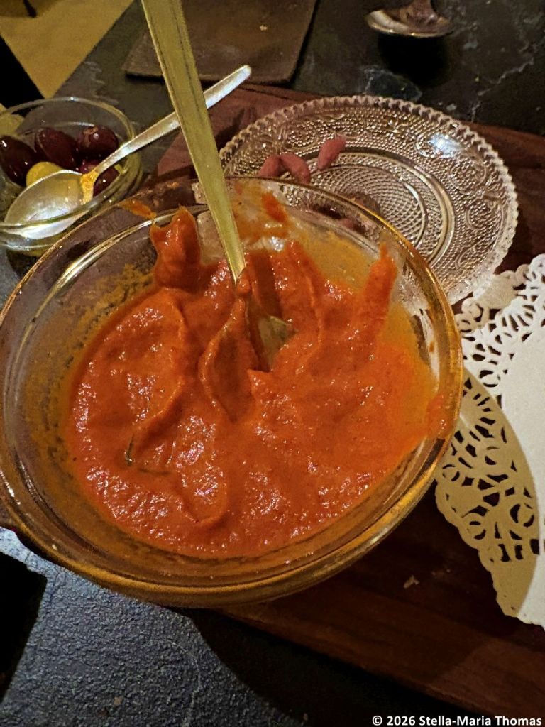 On arrival we found that we were in a lovely if somewhat empty room, even though it was almost 9pm, although the bar section of the place was busy. There was a tasting menu at a very reasonable price but we really had eaten too much already to even consider that as an option. Instead we decided to do the very Greek thing of just ordering a couple of plates for the table, and then more if we needed it. And thus we found ourselves facing an aivar salad, which arrived with a bowl of olives, a basket of bread, and a bowl of fish roe salad (taramasalata) which they’d just added because they thought we should try it.