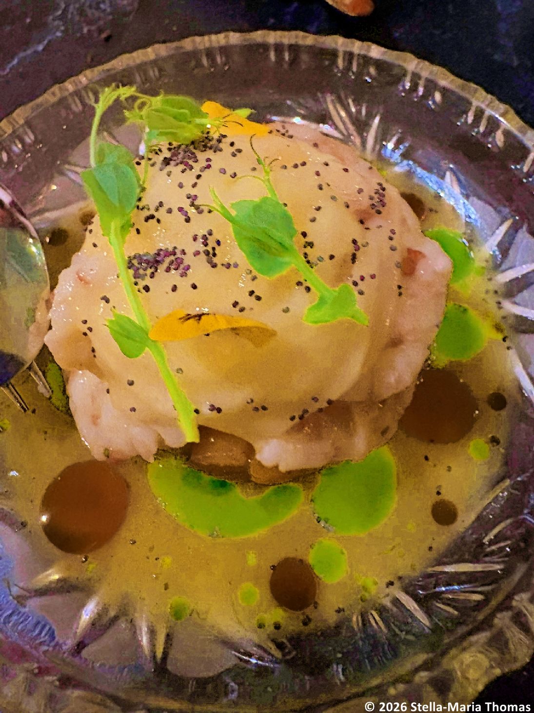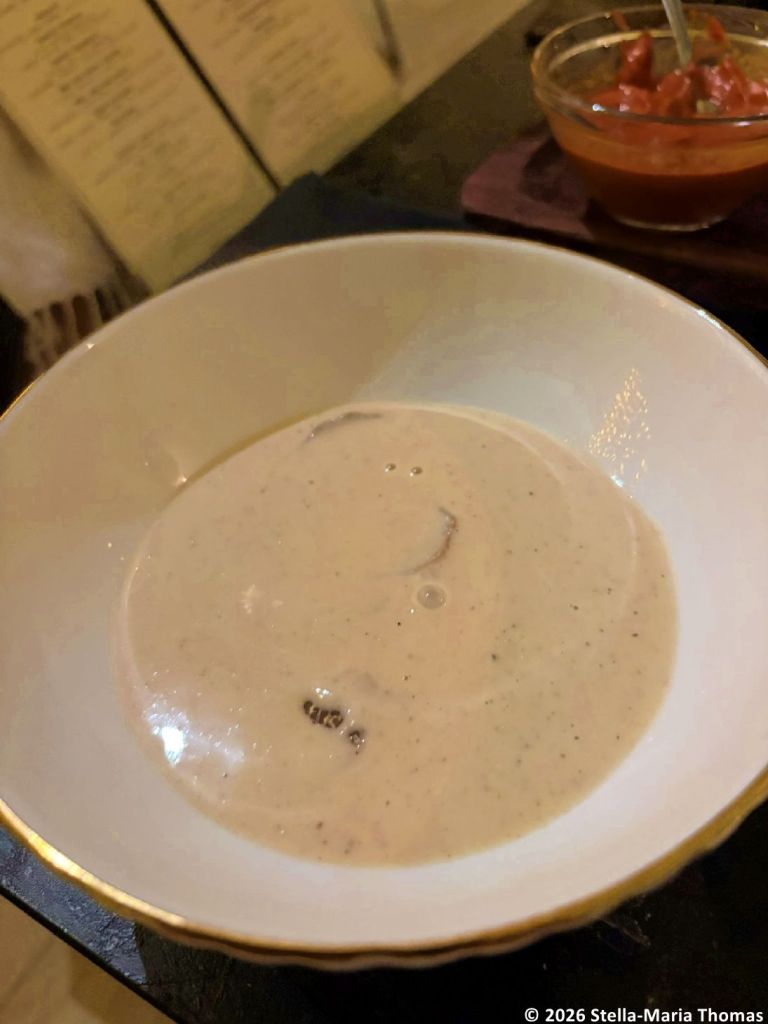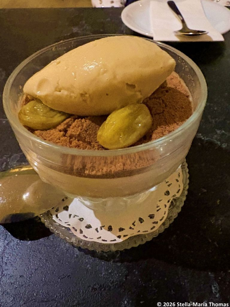 We followed up with an excellent cauliflower velouté, with white truffle shavings and pistachios, and a stunning good marinated shrimp, seasoned with lemon verbena, and garnished with tangerine and persimmon. And we finished the evening by sharing a dessert, the house speciality of Grape Must, described as a traditional Balkan recipe.