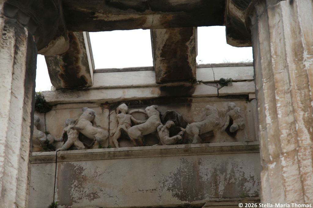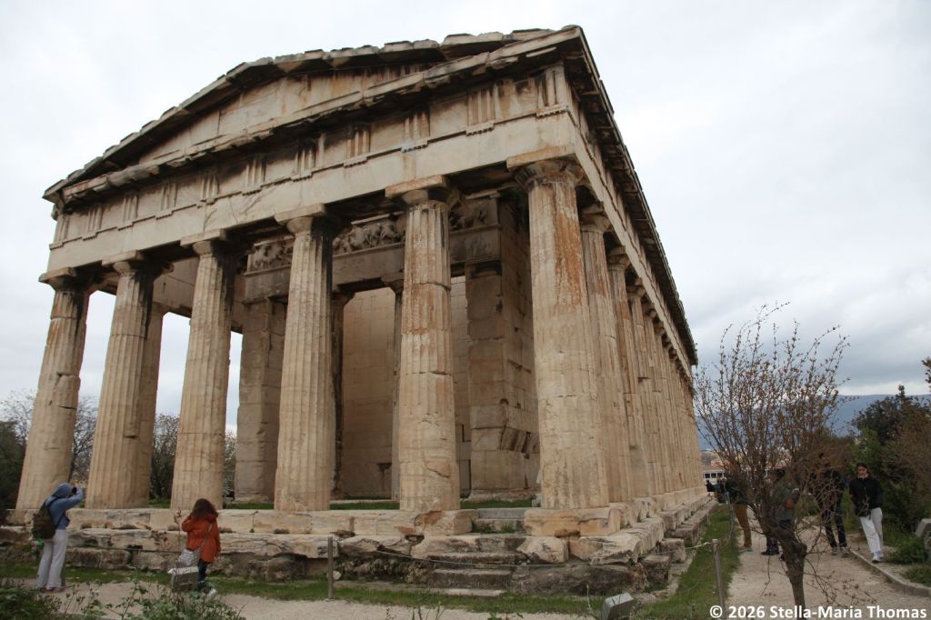 Once they’d settled down and flown off it was possible to concentrate on the archaeology in front of us. Given the site is massive we were never going to be able to give it the full level of attention it deserved, but we tried. For reference, it includes the following buildings and structures (the Stoa Poikile, the Stoa Basileios, the Temple of Aphrodite Urania, the Stoa of Attalos, the Square Peristyle, the East stoa, the Library of Pantainos, the Nymphaeum, the Mint, the Monopteros, the Bema, the Middle stoa, the Southwest Temple, the South-east Fountain House, the South Stoa, the Aiakeion, the Strategeion, the Agoraios Kolonos, the Tholos, a Boundary stone, the Monument of the Eponymous Heroes, the Metroon, the Bouleuterion, the Temple of Hephaestus, the Temple of Apollo Patroos, the Stoa of Zeus, the Temple of Zeus Phratrios and Athena Phratria, a statue of the Roman emperor Hadrian, the entrance to the Odeon of Agrippa, an Altar of Zeus Agoraios, the Temple of Ares, the Odeon of Agrippa and accompanying gymnasium, and possibly the remains of a synagogue). It’s way bigger than you might expect from some of the guidebooks. We started at the top at the Temple of Hephaestus, which is a lot more intact than many. From there we made our way down towards the museum, passing many of the named structures on the way and being glared at by a number of neighbourhood cats for our troubles.